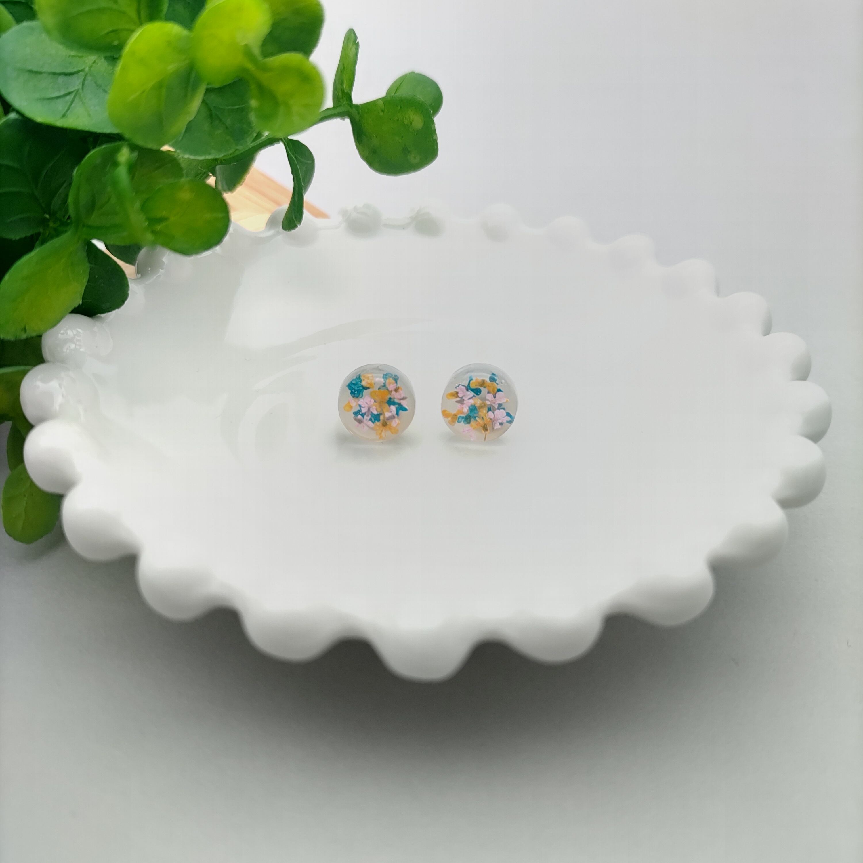透きとおるレジンの中で、色とりどりの花びらが光を受けてやさしくきらめきます。