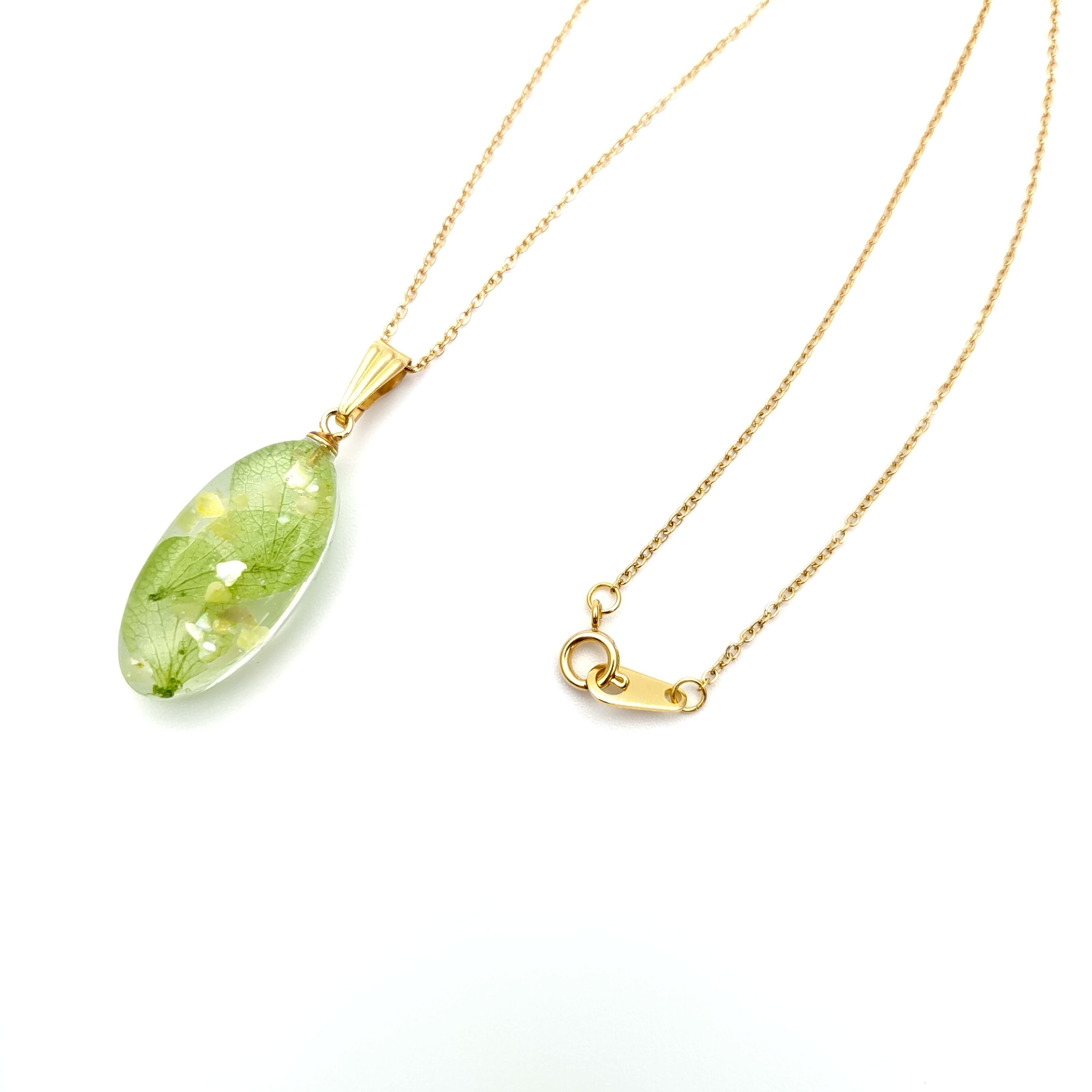 澄み渡る水の上に映る葉の美しさを閉じ込めたような、繊細で優雅なネックレスです。